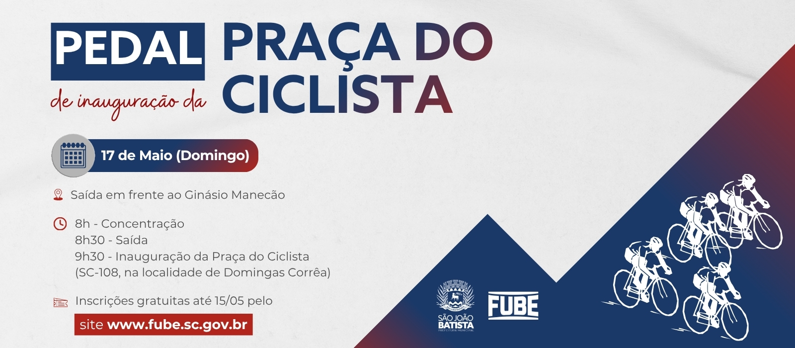 Um pedal aberto à comunidade, no dia 17 de maio (domingo), marcará a inauguração da Praça do Ciclista Adelir Gonçalves, no interior de São João Batista. A programação inicia às 8h, com concentração em frente ao Ginásio Manecão. A saída está prevista para 8h30, com destino à localidade de Domingas Corrêa, no bairro Colônia Nova Itália, onde ocorre a cerimônia oficial às 9h30. O retorno acontece logo após o ato.