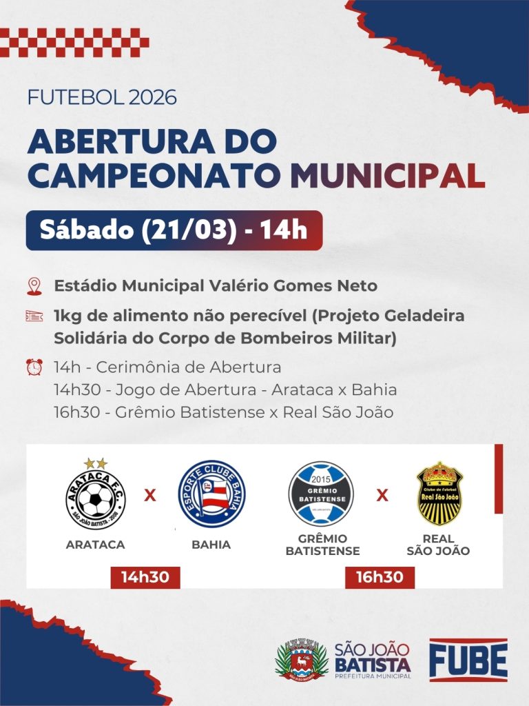Cerimônia e jogos de abertura acontecem no Estádio Valério Gomes Neto, a partir das 14h, com entrada gratuita A edição de 2026 do Campeonato Municipal de Futebol de Campo de São João Batista terá início neste sábado…