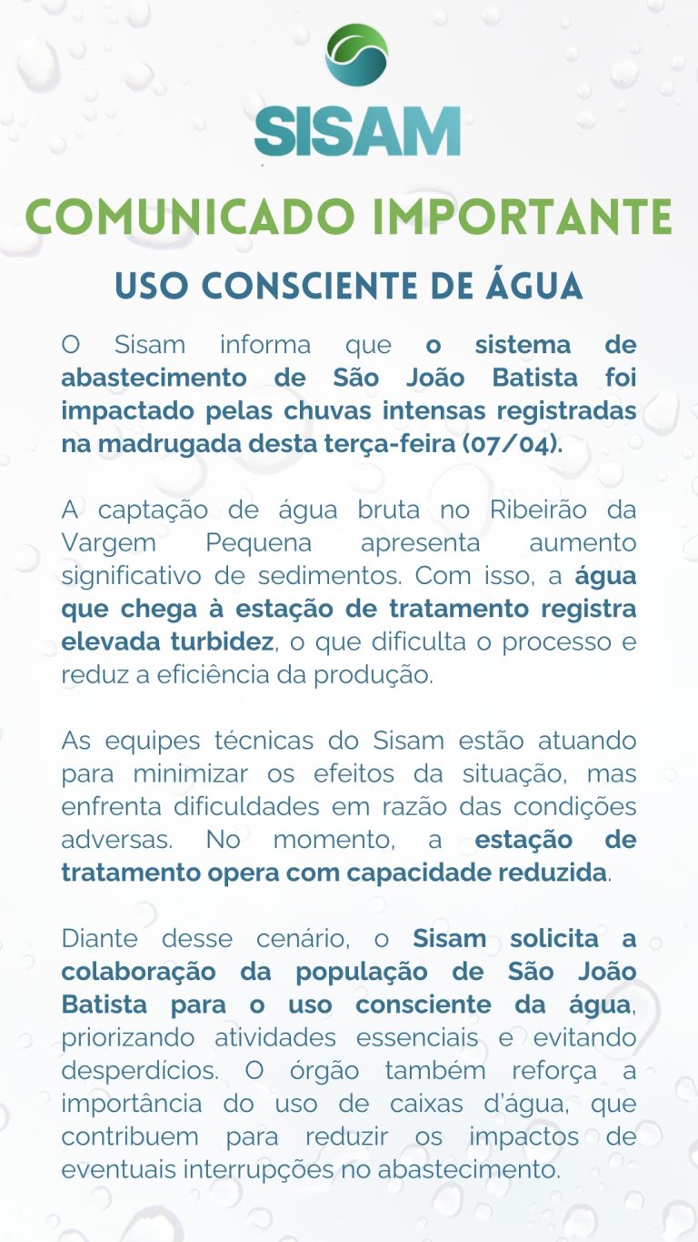 O Serviço de Infraestrutura, Saneamento e Abastecimento de Água Municipal de São João Batista (Sisam) informa que o sistema de abastecimento da cidade foi impactado pelas chuvas intensas registradas na madrugada desta terça-feira (07/04). A captação de água…