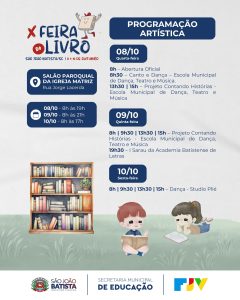 Vem aí a 10ª edição da Feira do Livro de São João Batista! Promovido pela Prefeitura de São João Batista, por meio da Secretaria Municipal de Educação e da Funjuve, o evento acontece de 8 a 10 de outubro, no Salão Paroquial da Igreja Matriz (Rua Jorge Lacerda), com entrada gratuita.
