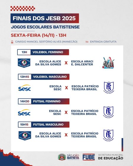 Decisões no futsal e no voleibol acontecem a partir das 13h, no Ginásio Manoel Sertório Alves (Manecão) As finais dos Jogos Escolares Batistense 2025 (Jesb)…
