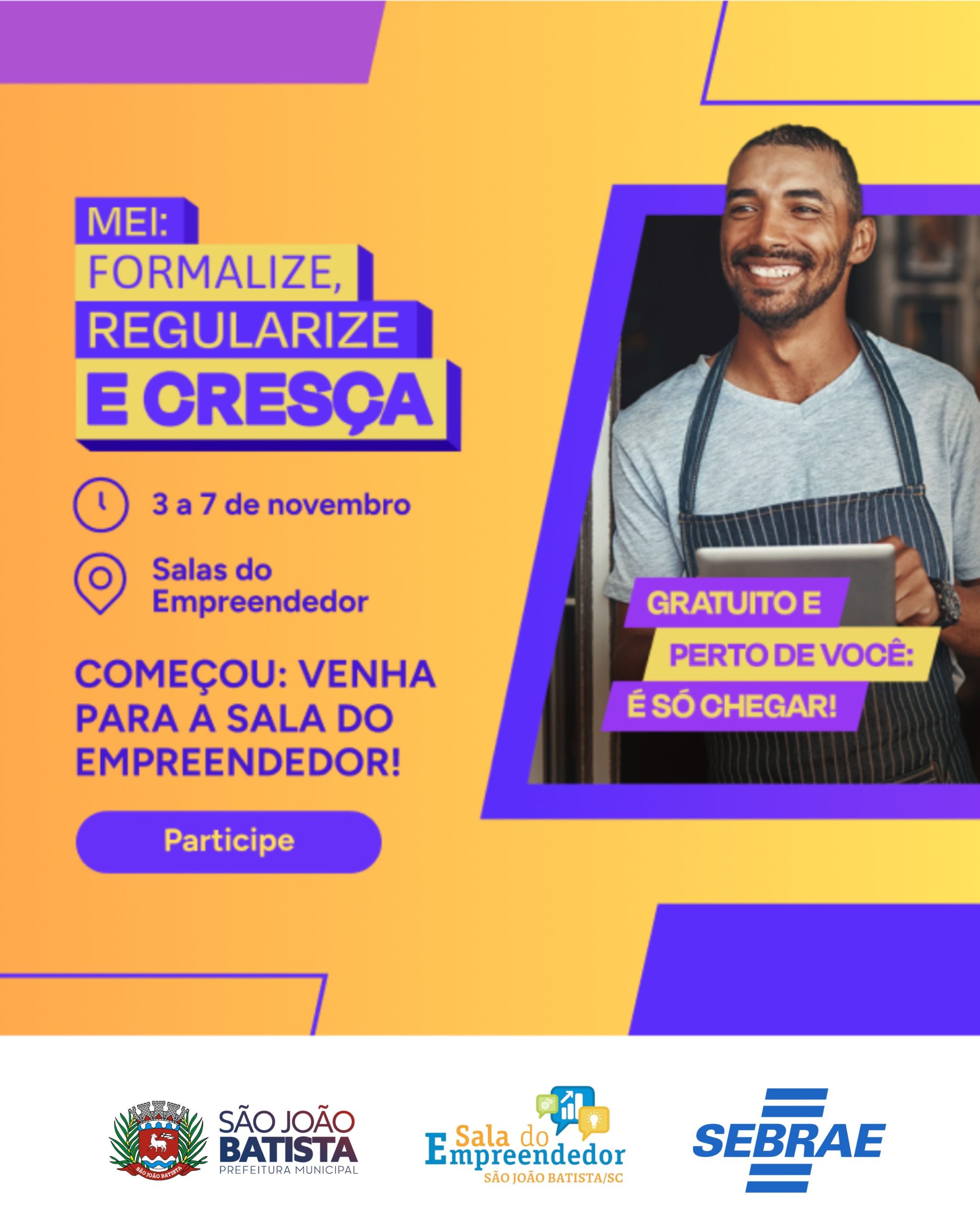 A Sala do Empreendedor de São João Batista, em parceria com o Sebrae/SC, promove entre os dias 3 e 7 de novembro a campanha “MEI: Formalize, regularize e cresça!”, voltada aos Microempreendedores Individuais (MEIs) do município. A ação oferece atendimento gratuito e personalizado para quem deseja abrir empresa, resolver pendências ou expandir o negócio após ultrapassar o limite de faturamento permitido na categoria.