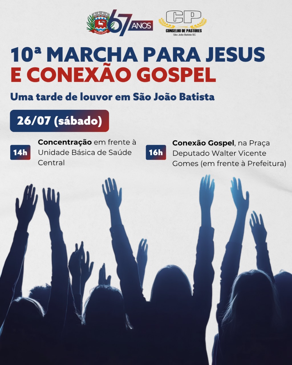 A 10ª Marcha para Jesus e a Conexão Gospel acontecem neste sábado (26/07). O evento tem como principais objetivos a valorização da família e a integração do público cristão com a comunidade. A atividade integra a programação comemorativa aos 67 anos de emancipação político-administrativa de São João Batista.