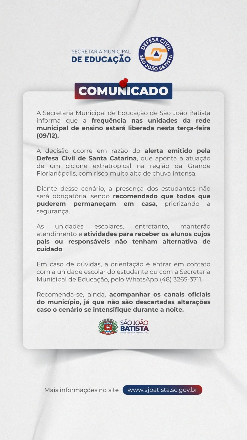 A Secretaria Municipal de Educação de São João Batista informa que a frequência nas unidades da rede municipal de ensino estará liberada nesta terça-feira (09/12).