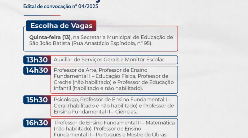 Candidatos listados no documento devem comparecer à Secretaria Municipal de Educação de São João Batista na quinta-feira (13/02), de acordo com horário de escolha de vaga para cada cargo