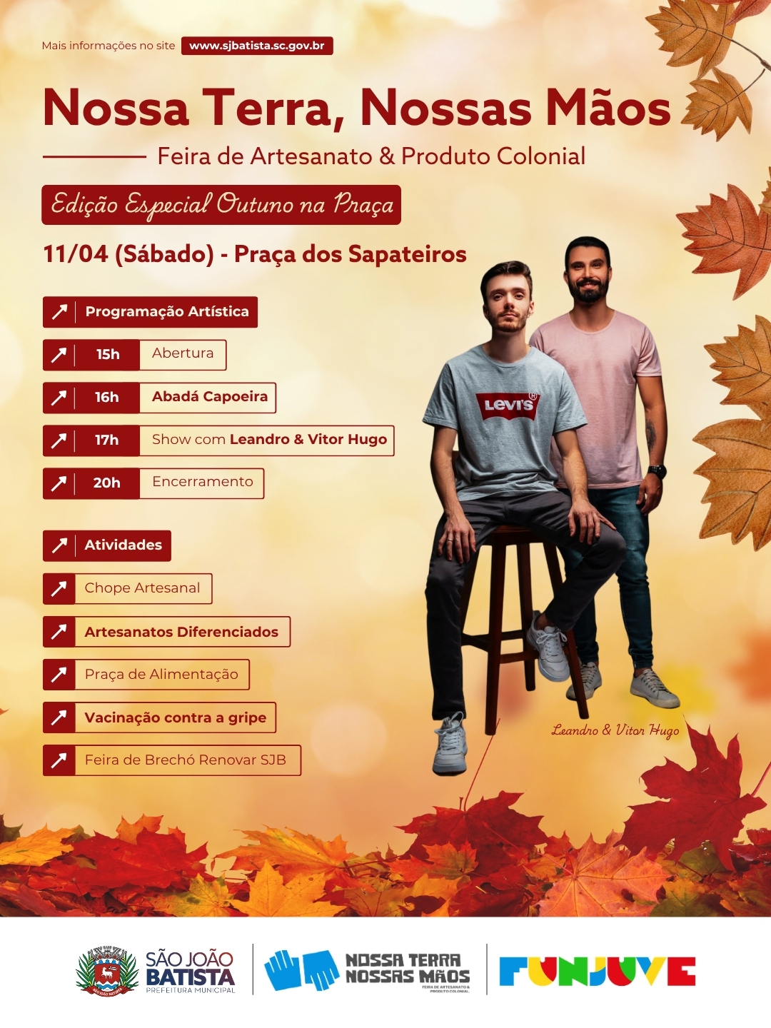 Cultura, música ao vivo e valorização da produção local vão movimentar a Praça dos Sapateiros no dia 11 de abril, com a primeira edição de 2026 da feira “Nossa Terra, Nossas Mãos”. Com o tema “Outono na Praça”, o evento será realizado das 15h às 20h, reunindo atrações artísticas, serviços de saúde e expositores do município. A entrada é gratuita.