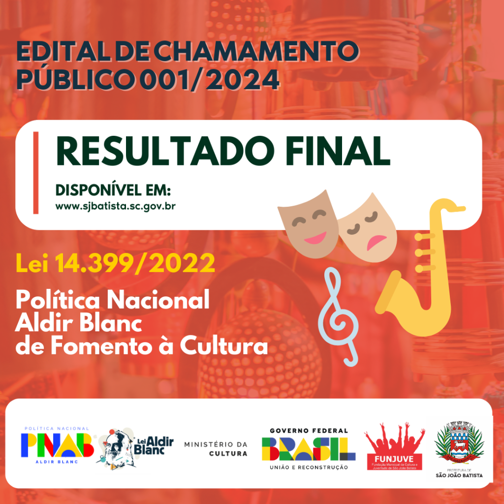 O resultado final do edital de chamamento público para a seleção de projetos via Política Nacional Aldir Blanc de Fomento à Cultura (PNAB) foi divulgado na última quinta-feira (05/12) pela Fundação Municipal de Cultura e Juventude de São João Batista (Funjuve). No total, foram contempladas 15 iniciativas apresentadas por agentes culturais locais.