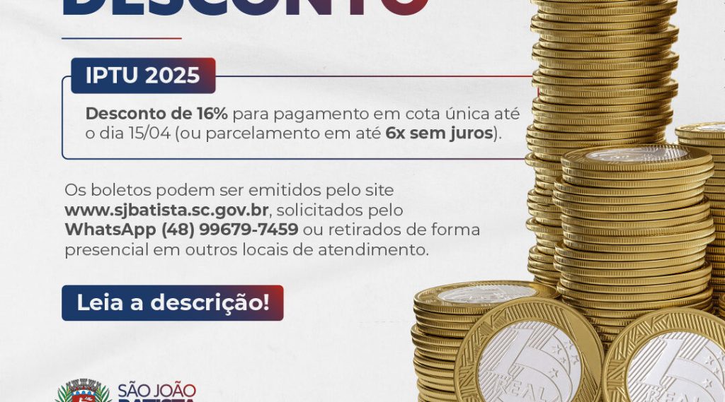 A administração municipal de São João Batista informa que as guias de pagamento do Imposto Predial e Territorial Urbano (IPTU) de 2025 serão disponibilizadas a partir desta quinta-feira (06/03). O desconto, para pagamento em cota única até 15 de abril, é de 16%.