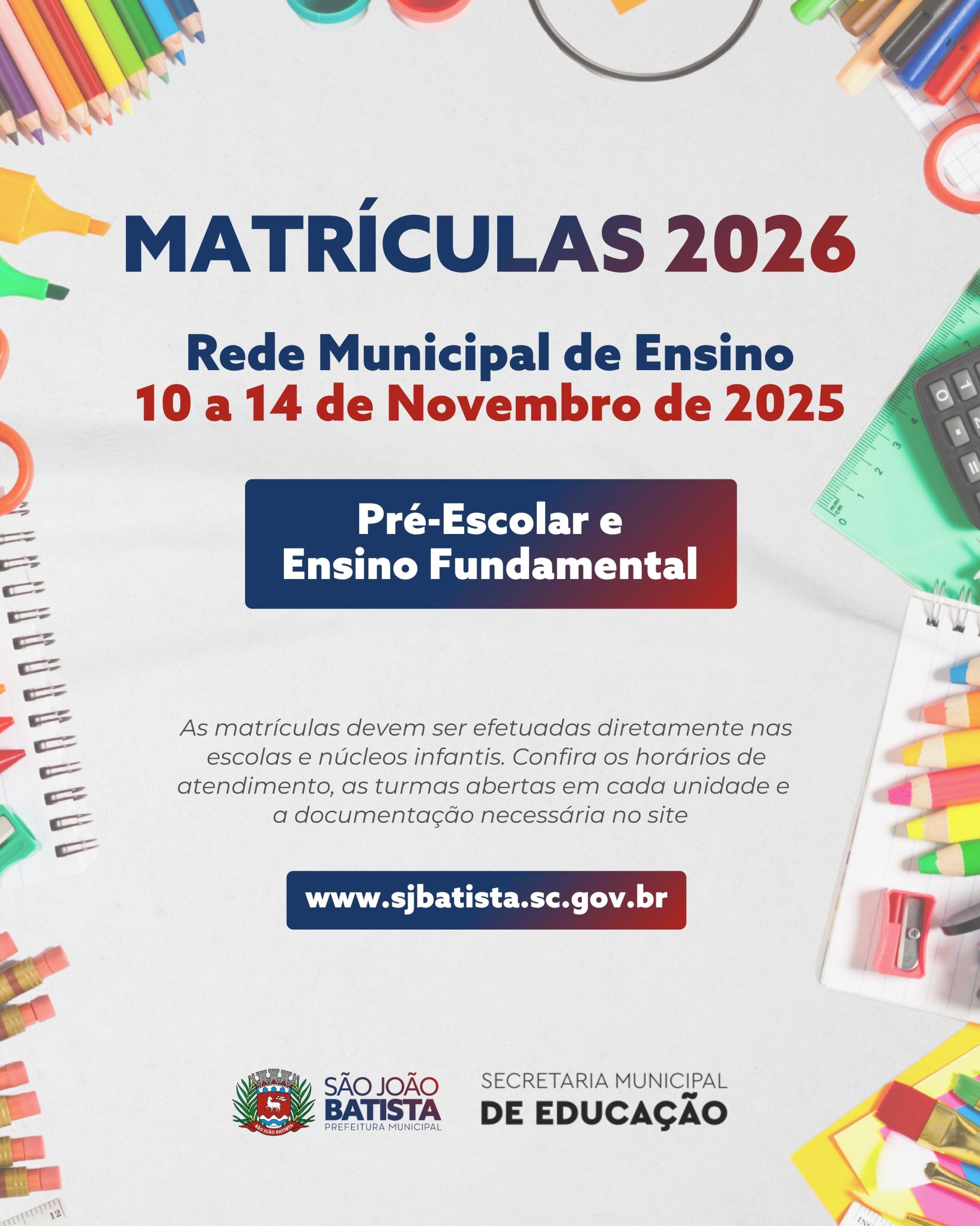 A Secretaria Municipal de Educação de São João Batista reforça o comunicado sobre o período de matrículas na Pré-Escola e no Ensino Fundamental para o ano letivo de 2026, que ocorre de segunda (10/11) a sexta-feira (14/11) da próxima semana. As inscrições devem ser feitas diretamente nas escolas e núcleos infantis (confira abaixo as turmas abertas em cada unidade e a documentação necessária).