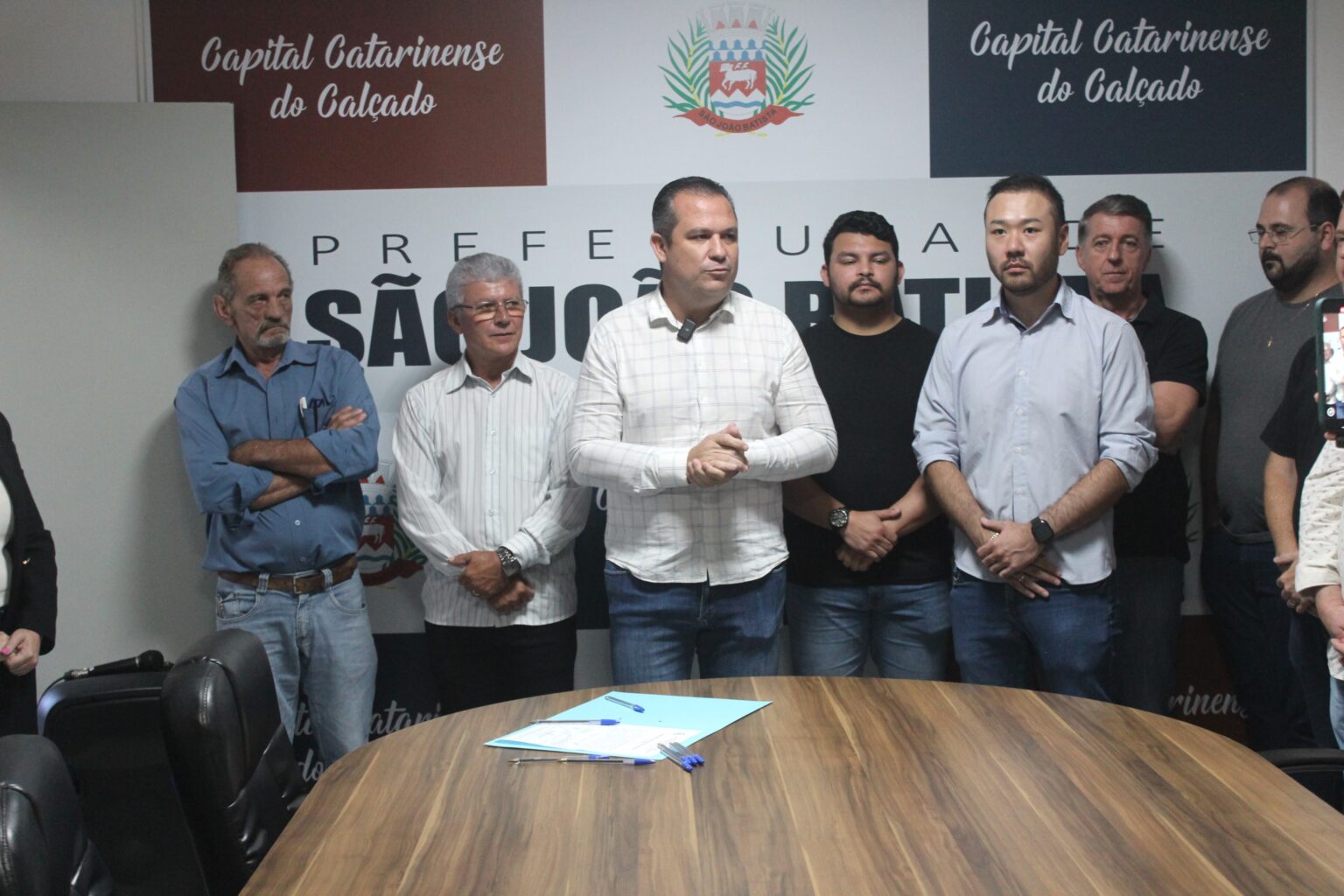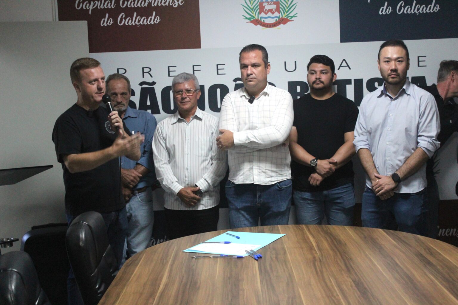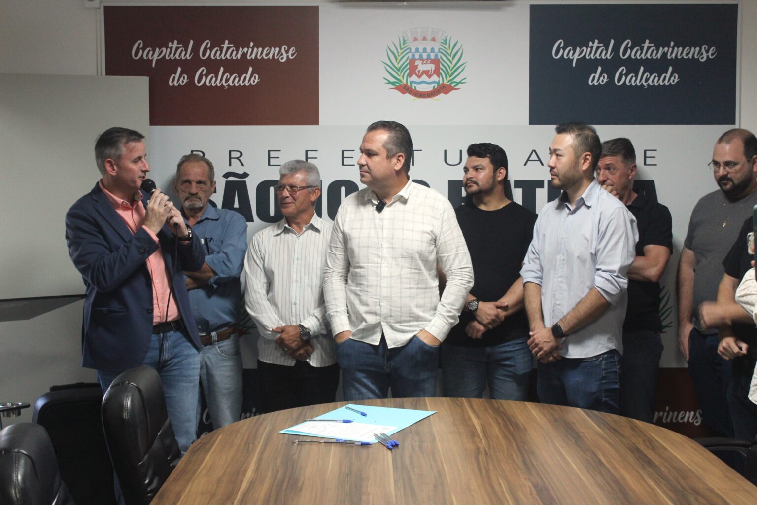 O prefeito Juliano Peixer e o secretário municipal de Infraestrutura, João Lacir Peixer, assinaram, na manhã desta segunda-feira (07/04), a ordem de serviço para a construção da nova Ponte dos Imigrantes Italianos, no acesso da SC-108 ao bairro Colônia Nova Itália. A obra será executada pela empresa Engepon Construtora Ltda, vencedora do Processo Licitatório nº 001/PMSJB/2025 – Concorrência Eletrônica nº 001/PMSJB/2025.