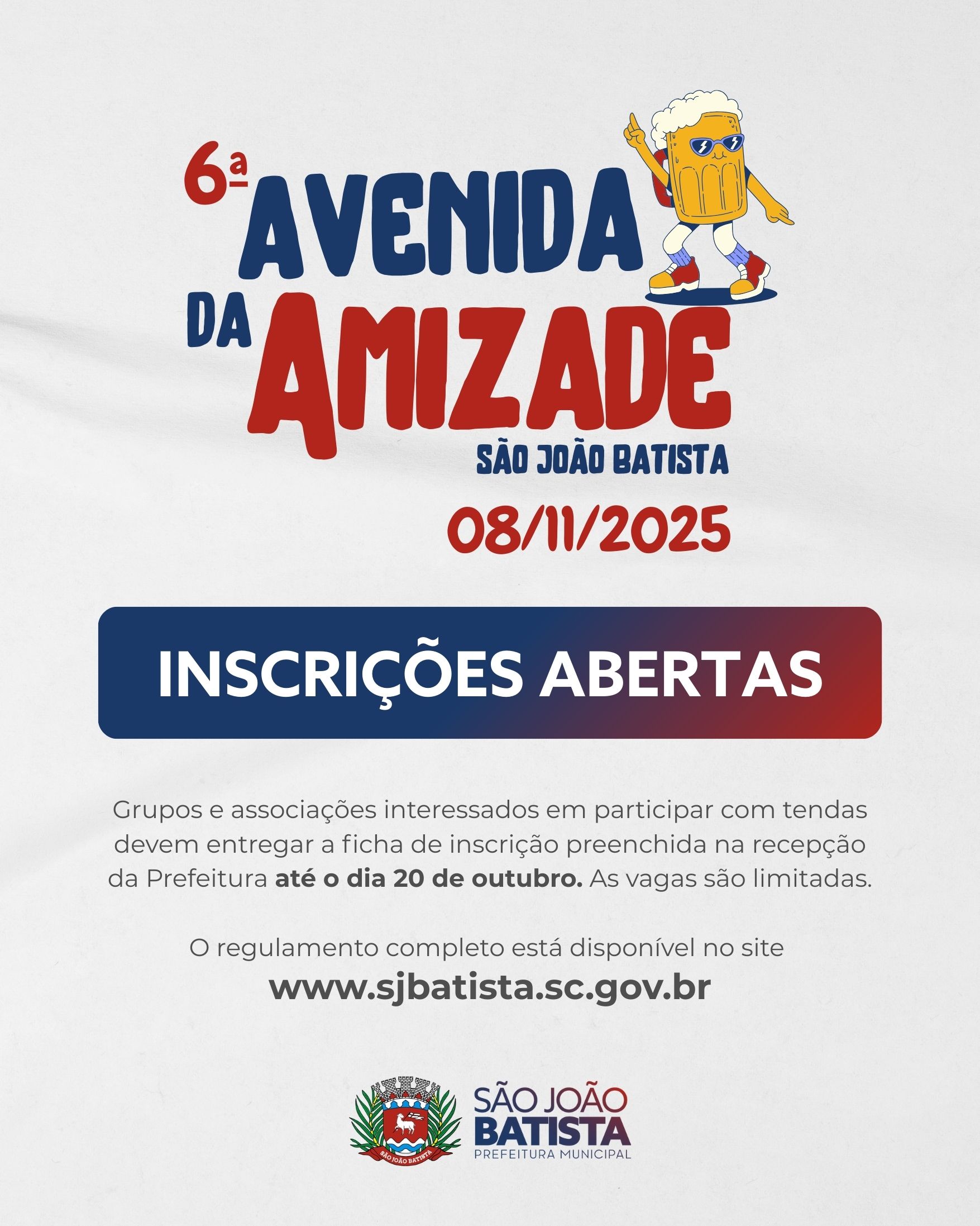A Prefeitura Municipal de São João Batista informa que as inscrições para a 6ª Avenida da Amizade já estão abertas. Grupos e associações interessados em participar da confraternização com tendas devem entregar a ficha de inscrição devidamente preenchida na recepção da Prefeitura. As vagas são limitadas.