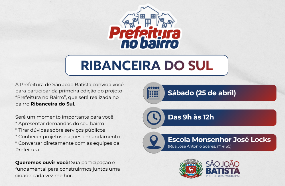 A iniciativa tem como proposta aproximar a administração municipal de São João Batista da população, criando um espaço direto de diálogo. Durante a ação, moradores poderão apresentar demandas, esclarecer dúvidas sobre serviços públicos e obter informações sobre projetos e ações em andamento voltados ao bairro.