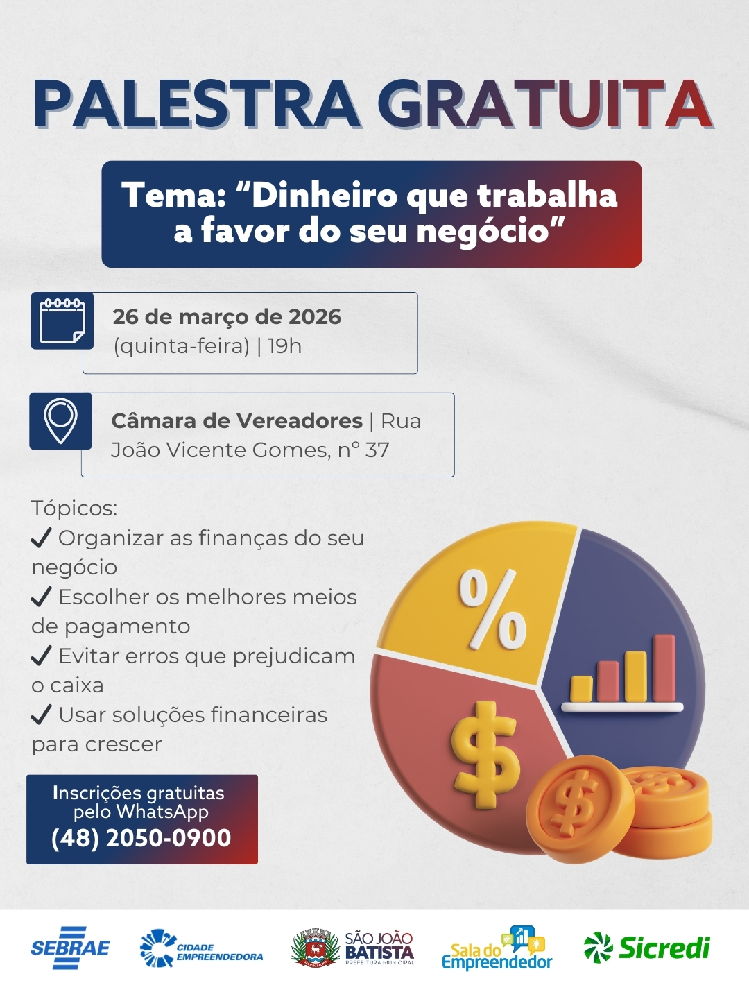 A Sala do Empreendedor de São João Batista realiza, no dia 26 de março, uma palestra gratuita voltada a empreendedores interessados em aprimorar a gestão financeira de seus negócios. O encontro terá como tema “Dinheiro que trabalha a favor do seu negócio” e acontece às 19h, na Câmara de Vereadores de São João Batista (Rua João Vicente Gomes, nº 37).
